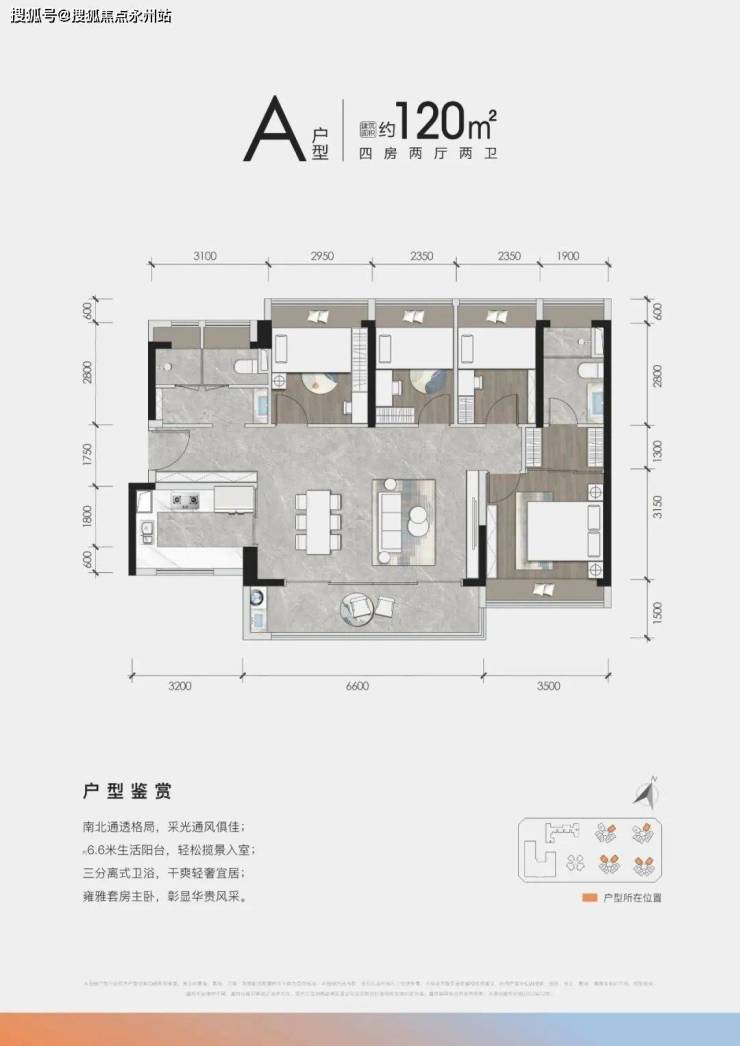120㎡的南北通透横厅四房两厅两卫,带6.6米宽境大阳台,各功能区面积更阔绰,很适合改善型家庭三世同堂。