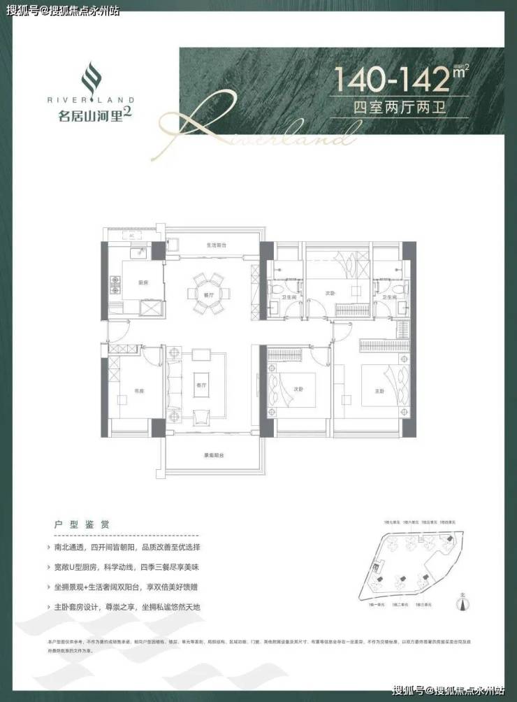 140-142㎡㎡的4房2厅2卫,设计的是竖厅格局,客厅4.3米开间,南北通透双阳台,四开间朝南,全屋飘窗,U型厨房,得房率:74.83%(不含赠送),阳台1.5米进深,主朝东南向。