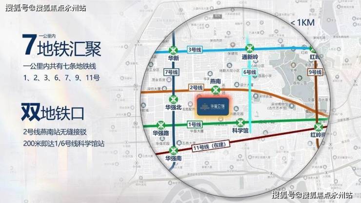 轨道交通:项目为三地铁交汇物业,距离2号线燕南站仅50米,步行300米可达1号线/6号线科学馆站,800米范围内覆盖1、2、3、6、7、9、11号七条地铁线,50余个地铁站口密集分布,30分钟内可直达宝安机场、香港西九龙等重要枢纽。2025 年新增的地铁11号线二期(华强南站)和穗莞深城际前皇段(皇岗口岸站)将进一步强化区域交通能级,实现大湾区“半小时通勤圈”。