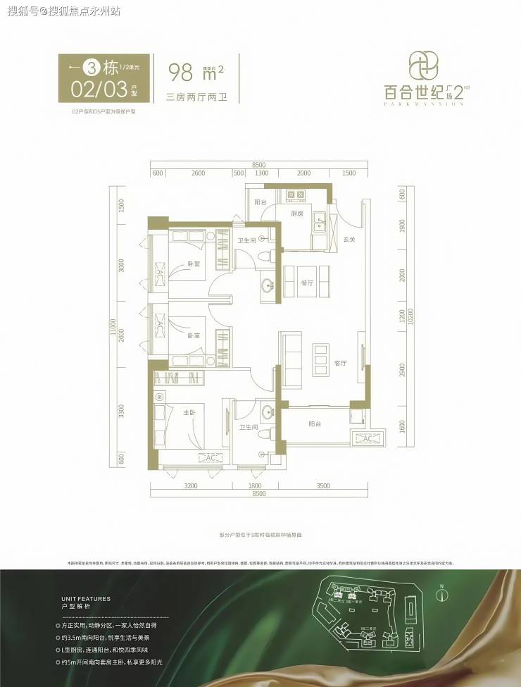 98-104㎡三房:总价约 500 万起,适合三口之家。
