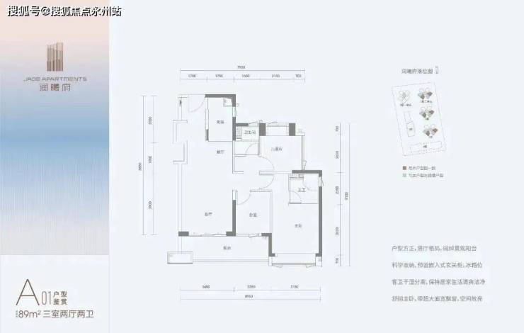 华润润曦府,华润很有诚意直接在户型图标出尺寸和得房率,展现了一把自信,89㎡三房两厅两卫共有A01和A02两种户型。