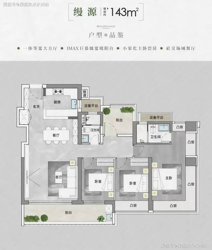 最后是本次最大的户型,143平大4房,使用率含赠送约95.89%,户型有两条腿,朝南看中山公园方向,有部分园景。这个户型就比较奢侈了,3个卧室和客厅4开间朝南,每个开间都有南向景观,除了有一个阳台改的次卧外,其他3个房间都可以不睡飘窗。