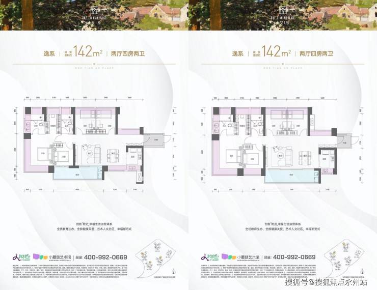 142㎡4房2厅2卫:两种不同的格局,分别分布在1栋2单元05户型/2栋1单元01户型和2栋1/2/3单元02户型,7.3米的超大客厅及相连阳台,空间开阔,包含外廊的实用率高达102%,主卧带大衣帽间的设计提升了居住品质,衣帽间可改造成小房间或书房,增加了户型的灵活性。