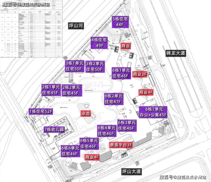 其中1栋住宅52F,2栋1-2单元住宅45F,3栋1-2单元住宅50F,4栋住宅49F,5栋住宅44F,6栋1-3-4-5-6单元住宅46F,6栋2单元住宅47F,6栋7单元办公+商务公寓45F,7栋为配套幼儿园;
