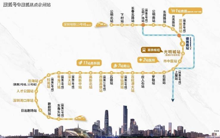 13号线北延段最高时速100公里,预计2025年开通运营,1站可到光明城站,换乘6号线/光明城高铁站,3站可到石岩,7站到西丽,8站到留仙洞总部基地,11站到南山高新园,
