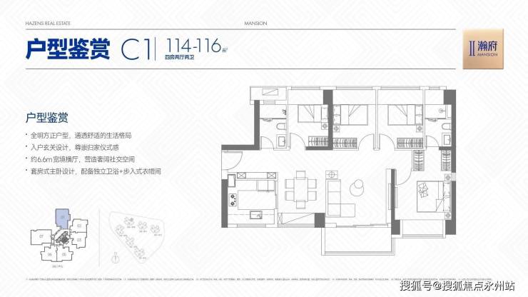 【建筑面积114-116㎡4房2卫】(C1)户型,横厅朝东南向,客餐厅开间6.6米,LDKB一体化设计,四开间朝南,全屋7面飘窗,主卧套房+步入式衣帽间,3个次卧朝西北向。得房率约78%(不含赠送)