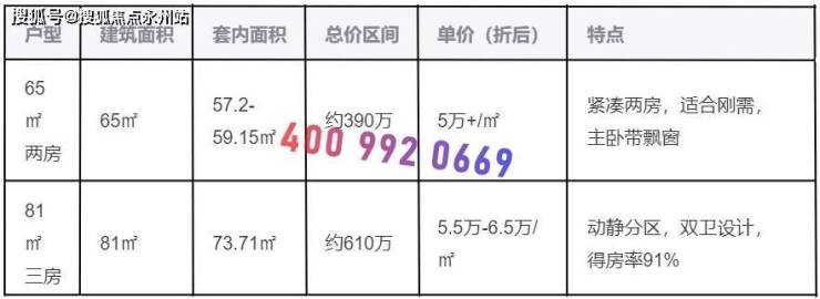 价格信息:备案均价约7.2万/㎡,综合折扣89折(最终折扣现场公示为准),折后均价约6.4万/㎡,65㎡2房总价395-430万,81㎡总价518-553万!