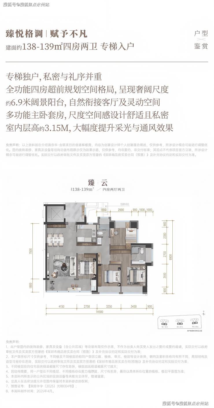 138-139㎡四房两厅两卫(精装交付):经典竖厅格局,LDKB 一体化设计(客厅 + 餐厅 + 厨房 + 阳台),4.15 米客厅开间,四开间朝南,采光通风极佳。