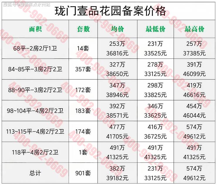 项目共901套房源,面积有68㎡的2房2厅1卫,85-89-99-102-104㎡的3房2厅2卫,101-114-116㎡的4房2厅2卫户型,备案均价3.91万/㎡,备案单价3.31-4.96万/㎡,总价在231-574万/套,计划在2026年6月带精装交房。(深圳珑门壹品售楼处电话:400-992-0669)