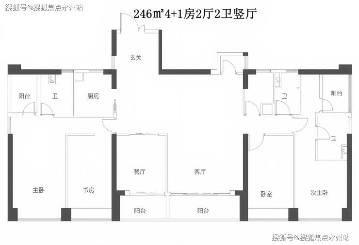246㎡4+1房2厅2卫竖厅:项目客厅、四个房间全正南向,观城市景观及海景,双主卧套间设计,带独立衣帽间,卫生间双台盆,全屋无暗房暗卫。