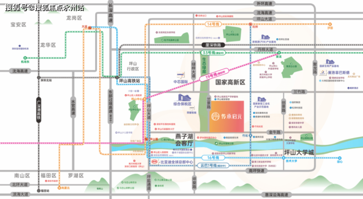 传承启元府地处高新区、坪山大学城和燕子湖片区三核之间,作为高新区目前规模最大的城市综合体,项目规划总建面约55万㎡,除住宅外,还涵盖了商业、产业办公、教育资源等多重业态。约3.2万㎡集群商业、包括社康、文化室、党群服务中心等在内的约2万㎡公建配套、约6000㎡公交首末站,可一站接驳地铁/云巴等轨道。