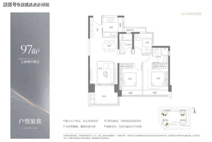 建面约83㎡三房,主卧通透双面凸窗设计,厨房烟道外移对于中小户产品的空间利用提升明显,小开窗的加入在细节上提供更好的体验。
