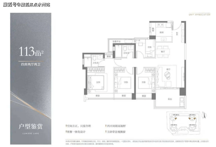 建面约113㎡四房,可做到全功能四房空间,四开间阳光充足。主卧额外小窗提升空间采光,补充自然光线和功能台面。