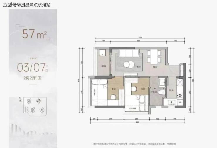 57平2房2厅户型:客厅开间2.75m ,而且还做了一个独立的玄关位,,非常适合小两口刚需上车自住使用,也是卖的最快的一个户型。