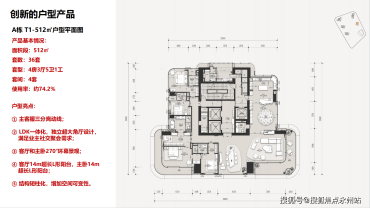 512㎡四房五卫+家政套间:最后来个顶的512㎡四房五卫+家政套间,分布在A栋43F,一层3梯1户,每层层高3.6米,相当于整层都自己家了。