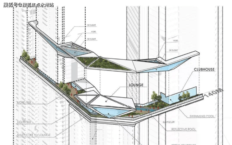服务式公寓塔楼与周边的地铁站无缝连接,可通过地面裙楼大堂或是通过地下商业大堂出入口便捷通达。设计在塔楼150米处打造了空中平台,设置了空中花园、健身房、会所以及各种休闲和娱乐设施,在俯瞰城市壮丽美景之际,为面向深圳中央商务区的高端公寓的居民提供了宜人的公共空间。服务式公寓塔楼的弧形阳台立面以云朵为设计灵感,简约的轮廓搭配银白色铝饰面,突显出典雅的几何之美。