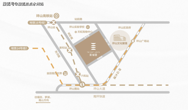 双地铁∶16号线新和站(在建中,预计2023年通车)、14号线坪山广场站(在建中,预计2022年通车)。