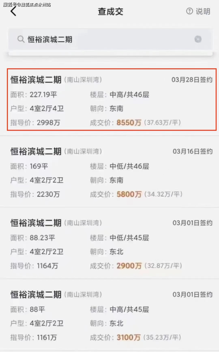 ②2栋高层,227㎡的4房,东南向看海景,成交总价约8550万,单价约37.7万/㎡