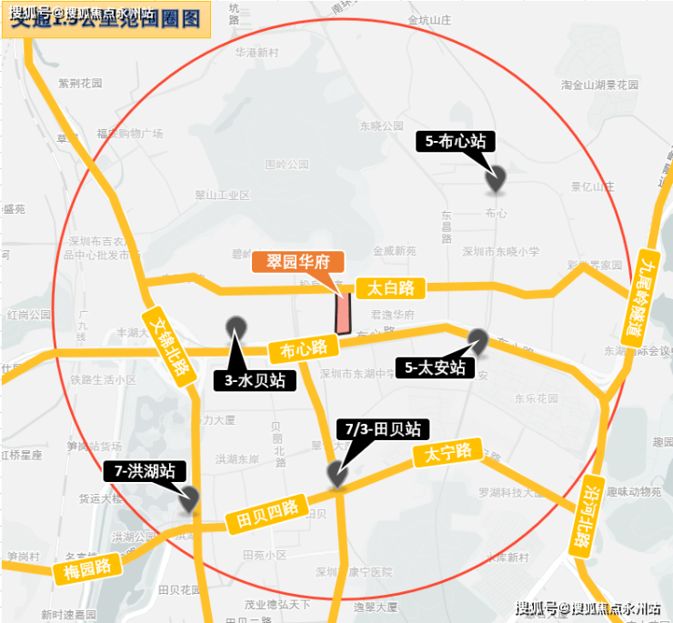 翠园华府楼盘位于深圳市罗湖区太白路与东盛路交汇处,毗邻开智幼儿园、奥斯韩外语学校及东湖中学,对面是园岭公园,方圆500米内有粤海城、太阳新城等商业配套,再远一些,2公里内还有喜荟城、IBC、万象汇等,不仅可满足日常的购物需求,也可满足消费升级需求。距离地铁3号线水贝站约760米;5号、7号线太安站约1000米。学区为东昌小学、翠园东晓中学。