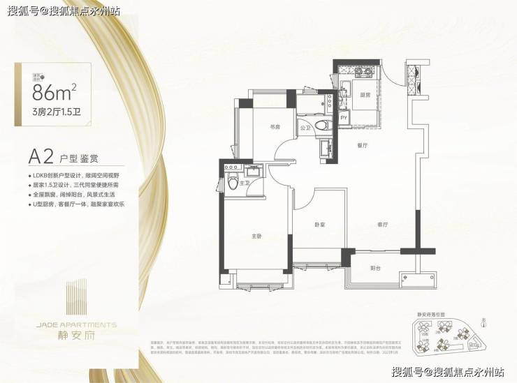 约86㎡3房1.5卫(1栋A座04/06户型、2栋03/05户型、3/4栋03/05/07户型)竖厅格局,餐客一体,动静分区结构,S型墙体预留冰箱位,创新型1.5卫设计,卫生间干湿分离设计,有东南、东北、西南朝向。