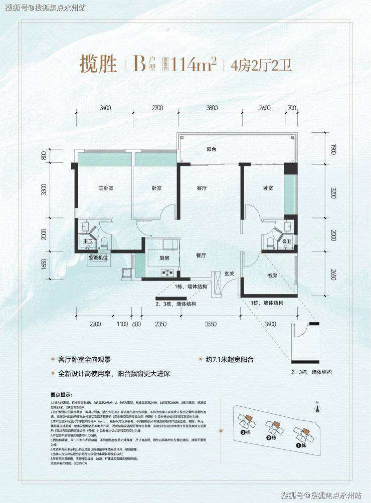 设计亮点:270° 观景 +7.1 米阳台 + 三卧室构建 13.2 米景观面。