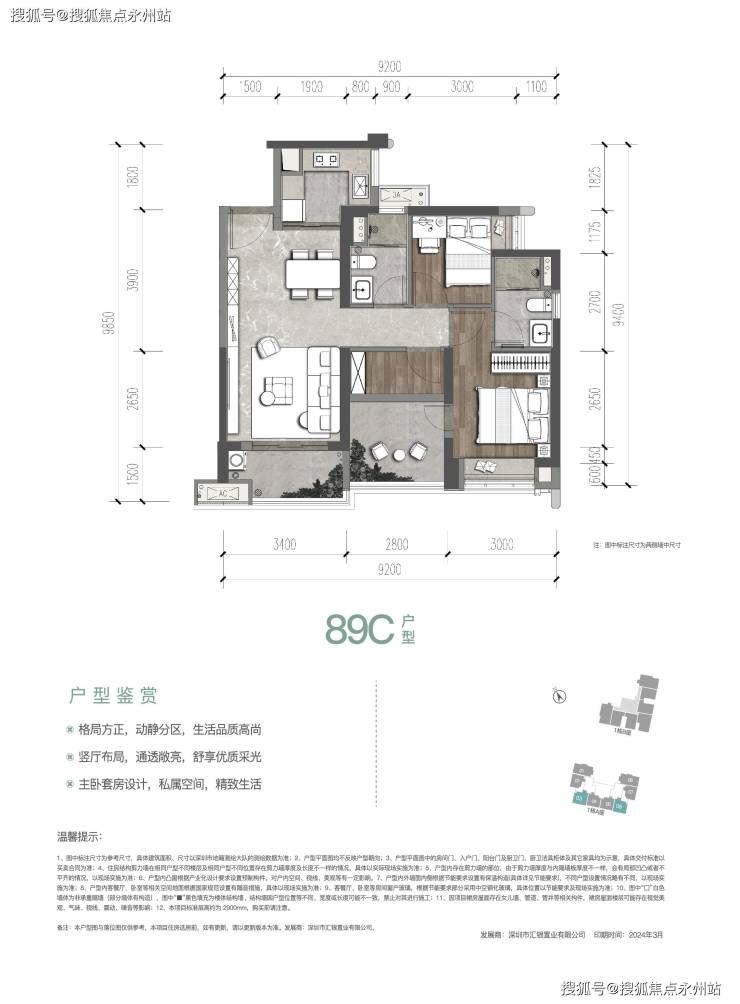 产品设计:主力户型为 89-128㎡3-4房,得房率约78.85%(不含赠送),计入赠送后实际使用率达90%,采用德系精装标准(西门子、杜拉维特等品牌)