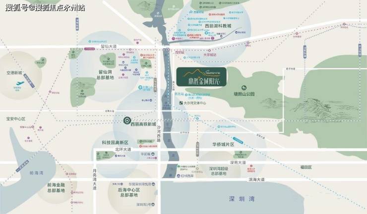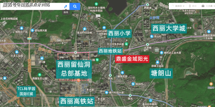 项目西侧为西丽留仙洞总部基地,东北侧为大学城,东侧为塘朗山,西南侧是西丽高铁站。