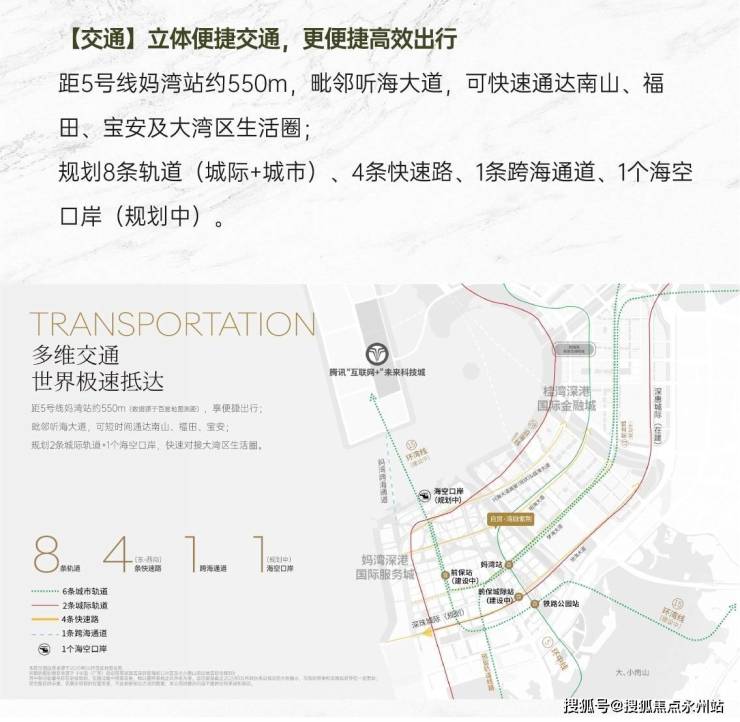 项目交通便捷,形成“地铁+城际+快速路”的立体交通网络:距地铁5号线妈湾站约500-550米,步行可直达,日常通勤南山、福田十分便捷,周边规划4条地铁线(含在建、规划)、2条城际线,其中深惠城际前保站即将完工,通车后将实现前海与大湾区城市群的快速联动,4条快速路(兴海大道、怡海大道、听海大道、梦海大道)环伺,可接入前海地下通道,迅捷接驳全城,同时临近规划中的妈湾跨海隧道及海空口岸,未来出行效率将进一步提升。