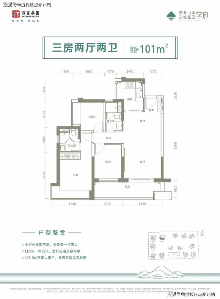 101㎡的3房2厅2卫,设计的是经典竖厅格局,进门入户玄关,客厅3.6米开间,LDKB一体化设计,三开间朝南,3个卧室分别做到了3.75米/2.7米/2.42米的宽度,客厅连接次卧出6.3米的大阳台,U型厨房,卫生间干湿分离,得房率:75%(不含赠送),西南或东南朝向。