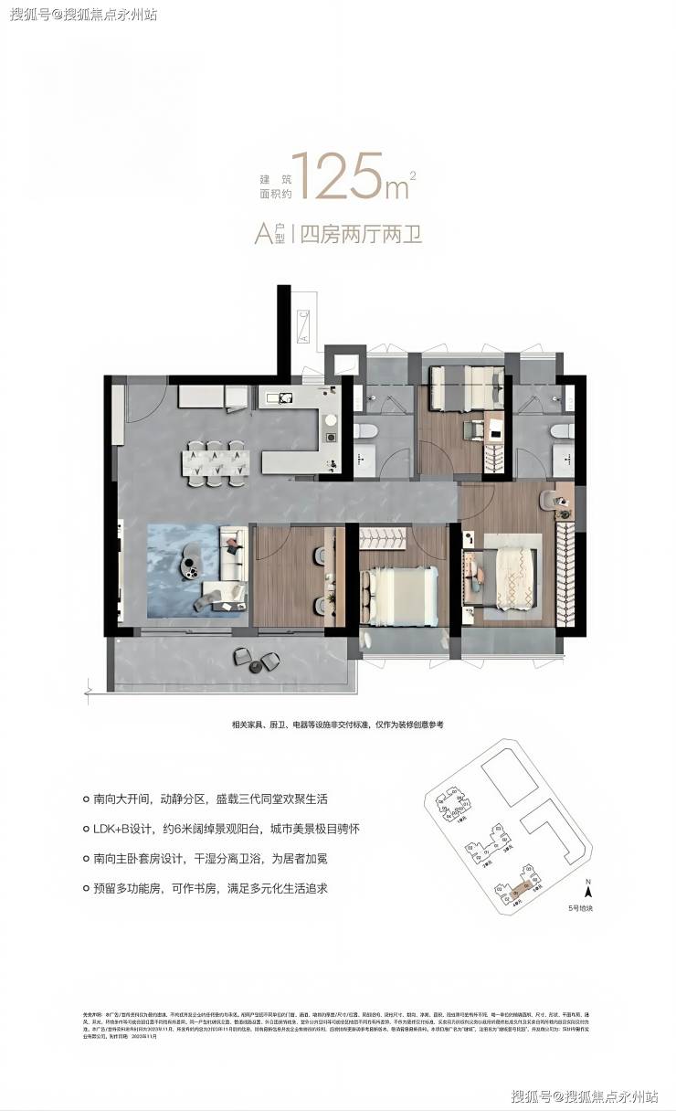 125㎡四房两卫(A 户型):四开间朝南,6 米长阳台,主卧面宽 3.5 米,东南朝向,总价 784 万起,定位终极改善。