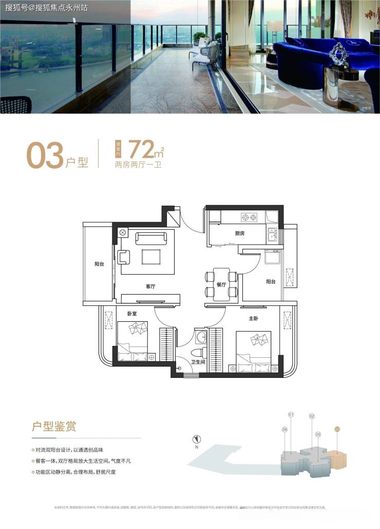 空间布局:客厅朝北偏东,采用经典竖厅设计,双阳台配置(生活阳台 + 景观阳台),可灵活改造为功能型三房。