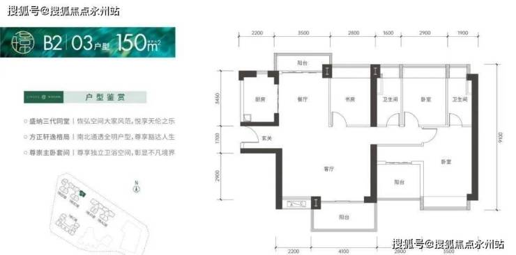 150㎡的4房2厅2卫,设计的是竖厅格局,南北通透双阳台,客厅6.3米大开间,进门入户玄关,4个卧室分别做到了3.5米/2.9米/2.8米/2.8米的宽度,U型厨房,卫生间干湿分离,得房率:75.66%(不含赠送),客厅阳台主朝西南向。