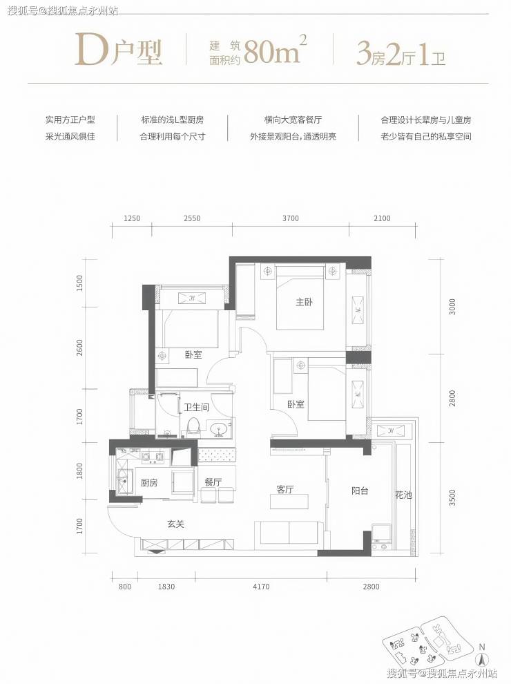 80㎡的3房2厅1卫,设计的是经典竖厅格局,客厅3.5米开间,进门玄关,LDKB一体化设计,动静分区,3个卧室分别做到了主卧12.9㎡/次卧8.96㎡/次卧8.16㎡(包含墙体飘窗),L型厨房,卫生间干湿分离,得房率72.48%(不含赠送),有朝东向或西向。