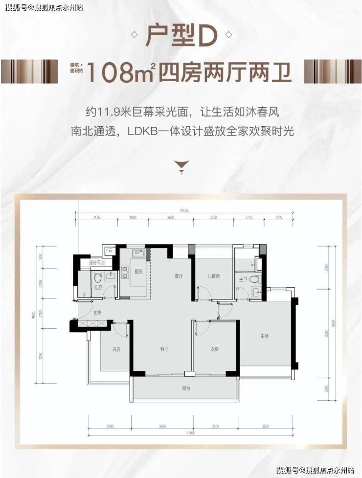 108㎡四房两卫南北通透设计,四开间朝南,客厅和次卧连接6.2米长大阳台,客厅开间3.6米,主卧双面采光。