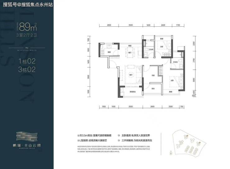 02户型:89㎡的3房2卫,设计的南北通透竖厅格局,客厅3.5米开间,三开间朝南,L型厨房,3个卧室做到了2.6/2.8/3.2米的宽度,阳台主朝东南向。