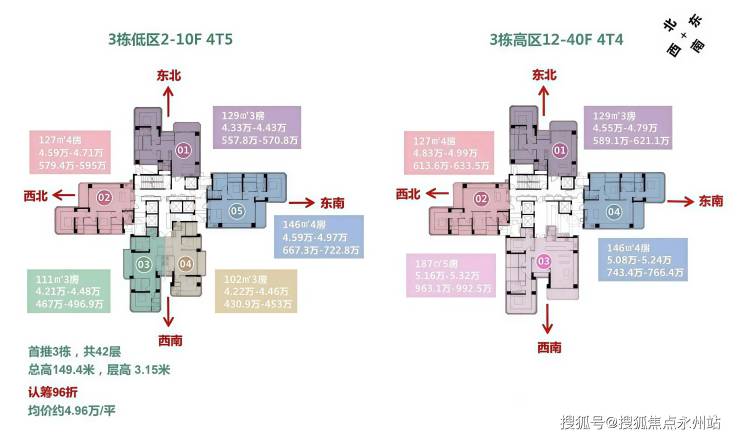 总栋数及楼高:4栋,31-44层梯户比:低区4梯5户,高区4梯4户