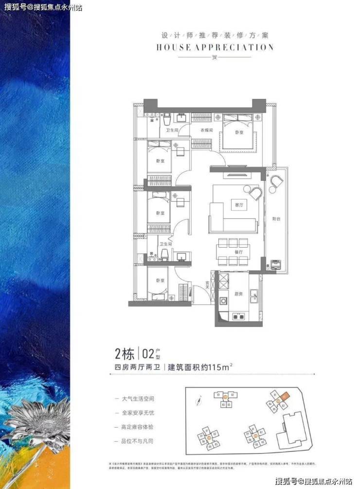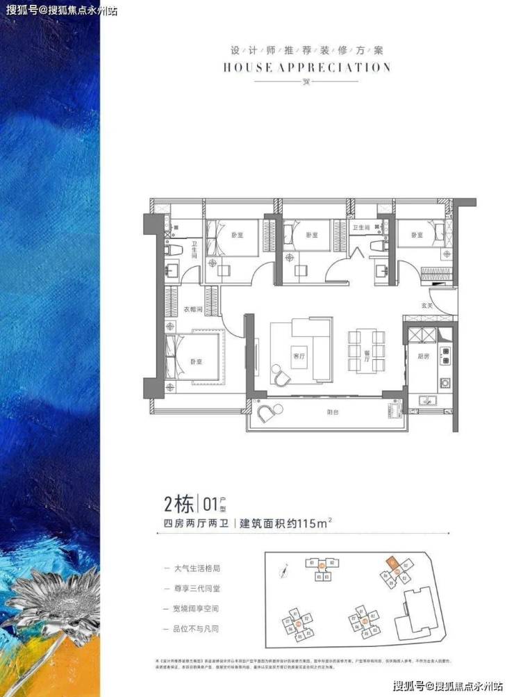 115平4房2卫,偏改善置换,格局方正,非常阔绰两个户型朝向分布东南&东北,视野都比较开阔,看阳台山和文艺中心景观很舒适。