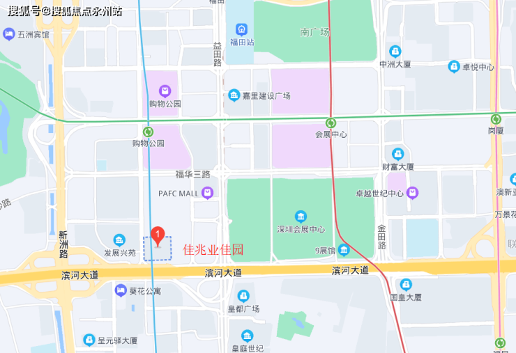 项目位于福田中心片区,滨河大道和民田路交汇处东北侧,距离购物公园站约500米。