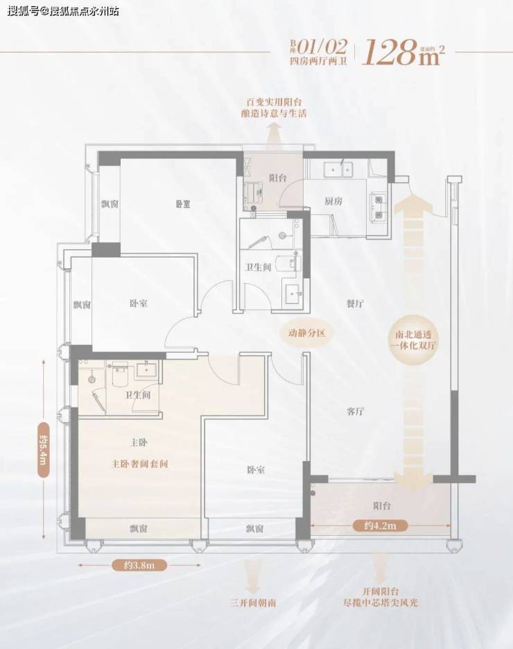 天宸128㎡户型图,双卫浴、双阳台设计,主卧大套房,空间开阔。