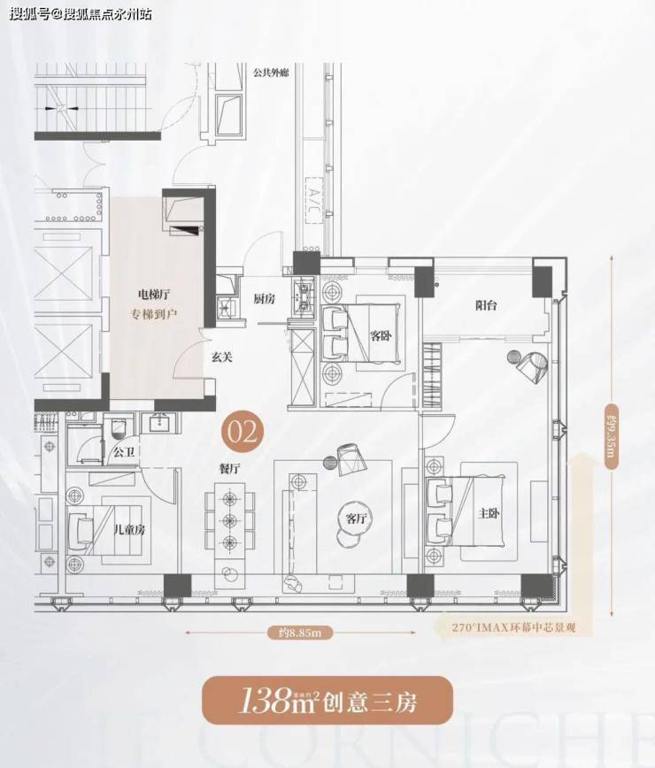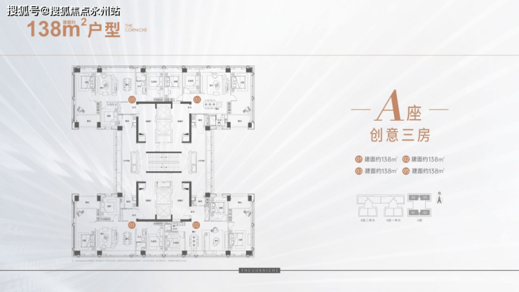 天宸138㎡户型,四梯四户,专梯入户,整个框架可以灵活打造,大面积没有承重墙和承重柱,可以随心设计自己的家。电梯厅加厨房,外部连廊加半个阳台算赠送面积,所以空间利用还算挺高。