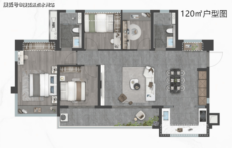 120㎡的4房2厅2卫:设计的是横厅南北通透格局,客餐厅开间8米,约14.7米超幕视野,超长阳台,主卧转角270°大飘窗,U型厨房,得房率:78.99%(不含赠送),阳台主朝西南或东南向。