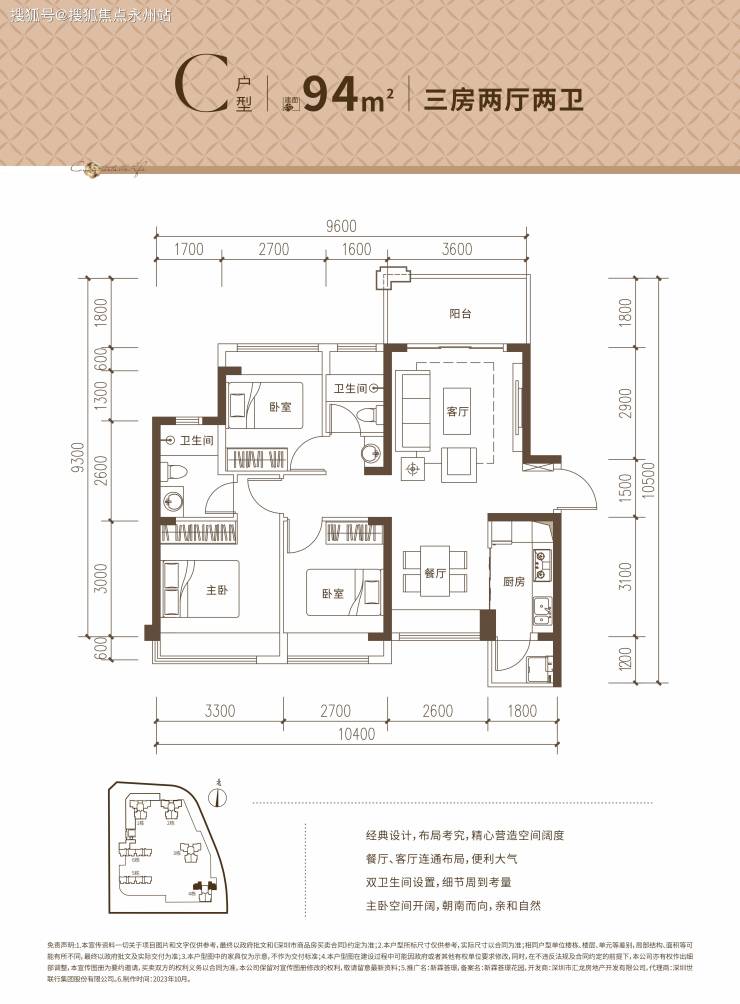94㎡的3房2厅2卫,设计的竖厅南北通透格局,客厅3.6米开间,带1个5.4米长的大阳台,阳台主朝南向,L型厨房,全屋飘窗设计。