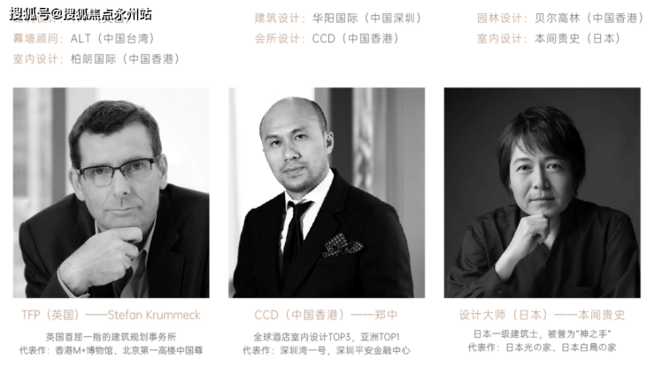 英国首屈一指的建筑规划事务所 TFP; 打造了 深圳湾1号、深圳平安金融中心的 国际大师郑中; 日本一级建筑士、被誉为神之手的设计大师 本间贵史……