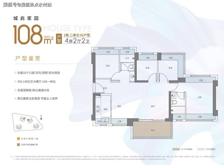108㎡的4房2厅2卫:设计的是横厅南北通透格局,进门独立玄关,客餐厅6.4米开间,LDKB一体化,五开间朝南,主卧双飘窗通透设计,全屋10个凸窗,4个卧室分别做到了主卧17.01㎡/次卧9.7㎡/次卧8.4㎡/次卧7.35㎡(包含墙体飘窗),L型厨房,卫生间干湿分离,得房率约91.88%(包含赠送),阳台主朝西南或东南向。