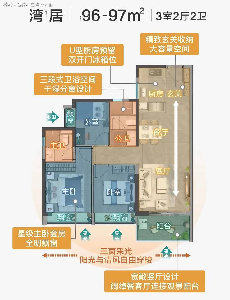 设计亮点:全明采光,厨房采用 U 型操作台,预留冰箱位;部分房源赠送约2.5㎡入户花园,可升级为玄关收纳区。