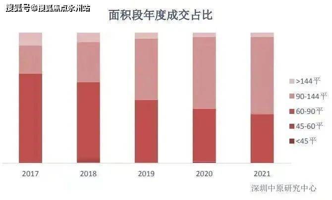据深圳中原研究中心数据,深圳新房 90-144㎡刚改户型的成交占比,近几年一直保持上升的态势,2021年深圳新房 90-144㎡户型成交占比接近六成,稳居户型需求第一。