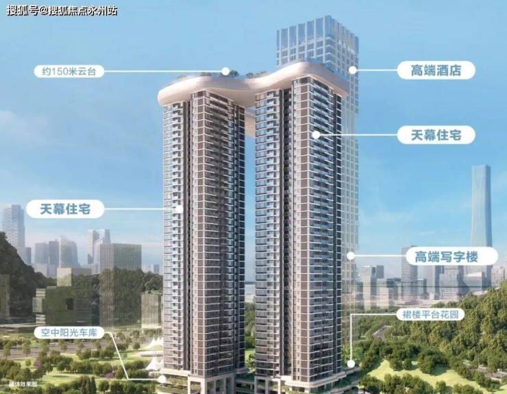 约150米云台设于住宅楼顶的150米高空,配置空中酒店、荧光跑道、无边际泳池等,成为一座深圳罕见的环幕观礼平台,360度观赏周边的山海景观,大有“云上观山,海上漫步”的意境。