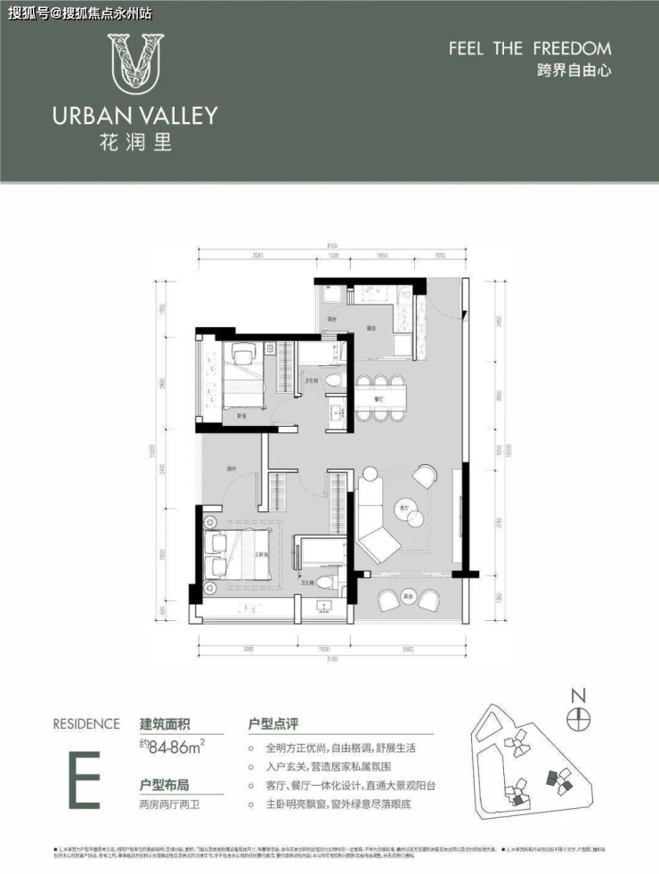 约84㎡的产品比较稀缺,分布在2栋和3栋,一共四条腿,朝南和朝北的都有。