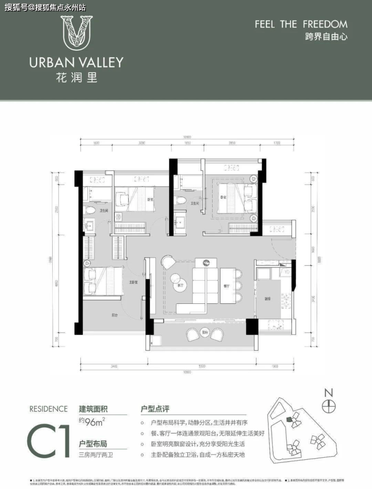 约96㎡户型的空间尺度进一步拉伸,且都是朝南的。