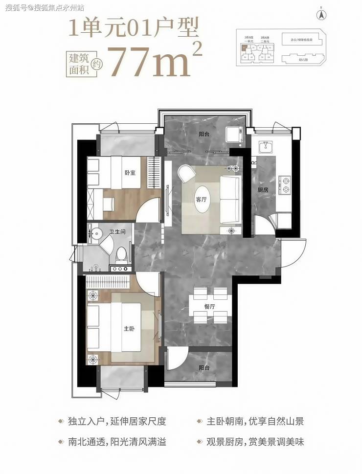 77㎡的2房2厅1卫,1栋1单元01户型,设计的是竖厅南北通透格局,独立入户,客餐厅分离设计,动静分区,南北双阳台,L型厨房,卫生间干湿分离,客厅阳台正北朝向。小户型里面难得可以做到南北通透且有双阳台的格局。